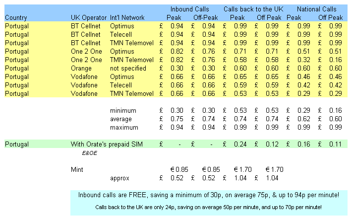 Orate Costs Comparisons - PORTUGAL Inbound calls are FREE, saving a minimum of 30p, on average of 75p, and up to 94 per minute! Calls back to the UK are only 43p, saving on average 50p per minute, and up to 70p per minute! ORATE Roaming Comparison 29th May 2001