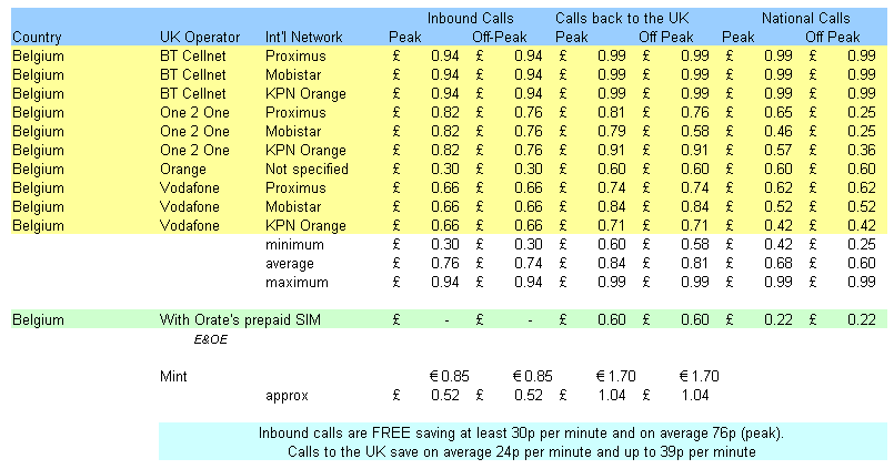 Orate Costs Comparisons - BELGIUM Inbound calls are FREE, saving on average 30p per minute and on average 76p (peak). Calls back to the UK save on average 24p per minute and up to 39p per minute! ORATE Roaming Comparison 25th April 2001