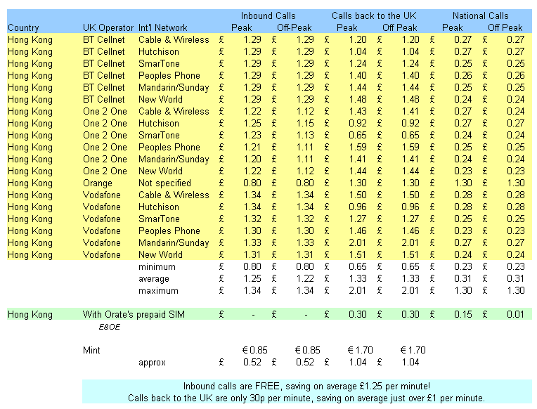Orate Costs Comparisons - HONG KONG Inbound calls are FREE, saving on average £1.25p per minute! Calls back to the UK are only 30p, saving on average just over £1 per minute. ORATE Roaming Comparison 25th April 2001