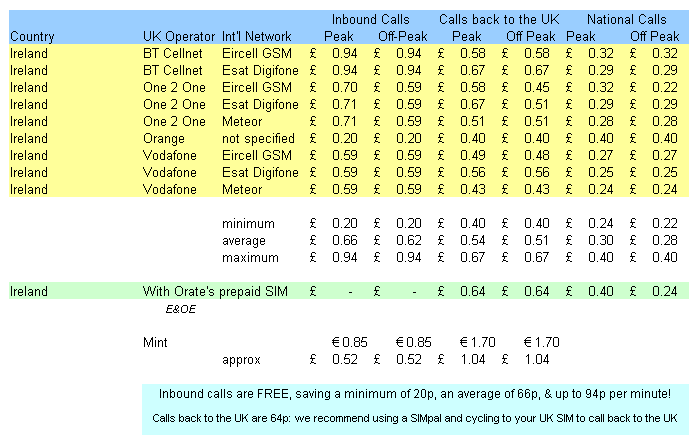 Orate Costs Comparisons - IRLAND Inbound calls are FREE, saving a minimum of 20p per minute, n average of 66p, and up to 94p per minute! Calls back to the UK are only 64p: we recommend using SIMpal and cycling to UK SIM to call back to the UK. ORATE Roaming Comparison 29th May 2001