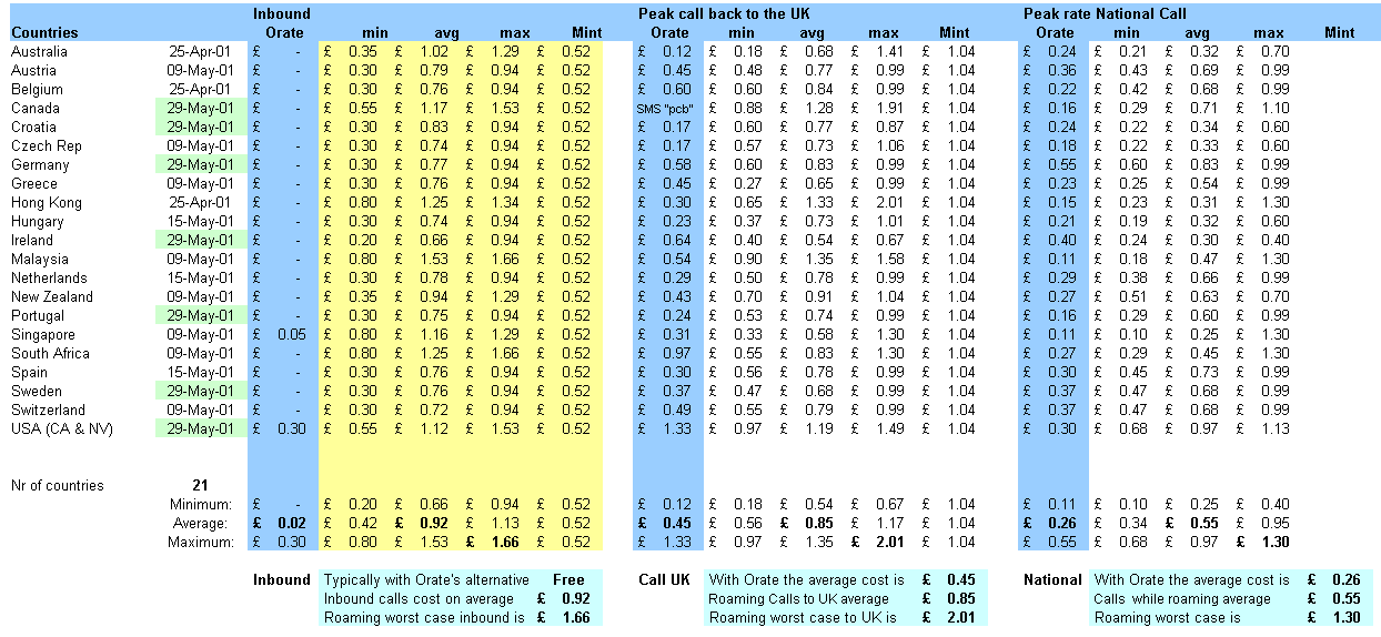 Orate Costs Comparisons - OVERALL ORATE Roaming Comparison April/May/June 2001