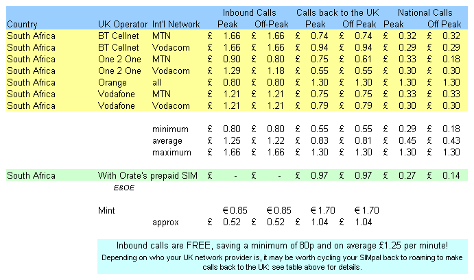 Orate Costs Comparisons - SOUTH AFRICA Inbound calls are FREE, saving a minimum of 80p and on average £1.25 per minute! Depending on who your UK network provider is, it may be worth cycling your SIMpal back to roaming to make calls back to the UK: see table below for details. ORATE Roaming Comparison 9th May 2001