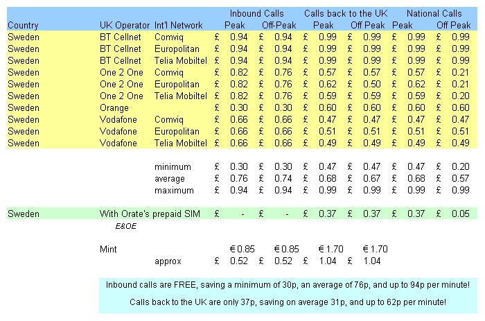 Orate Costs Comparisons - SWEDEN Inbound calls are FREE, saving a minimum of 30p per minute, and an average of 76p, and up to 94p per minute! Calls back to the UK are only 37p, saving on average 31p, and up to 62p per minute! ORATE Roaming Comparison 29th May 2001